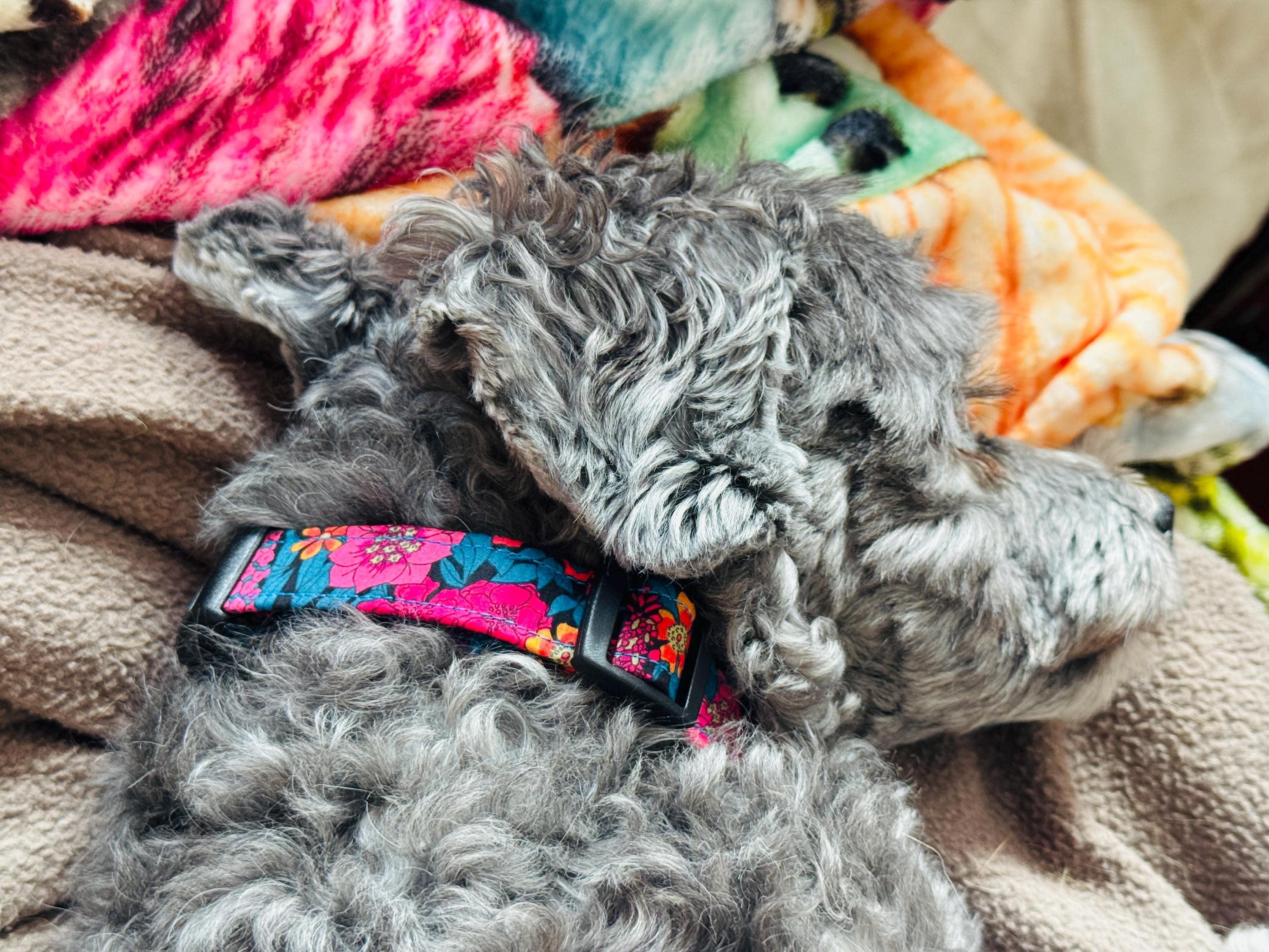 Collar is fantastic. Lovely pop of colour. Clip and d ring are good quality and nicely shaped so easy to clip a lead on. I have 1 criticism for the collar. It being small, the designer tag takes up a lot of space, smaller one would be nicer so more of the pattern is visible when worn.